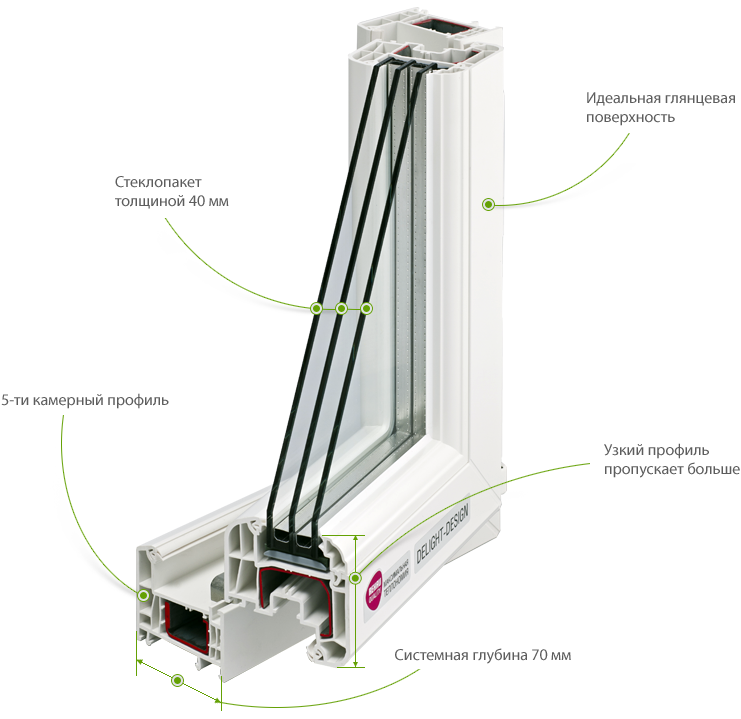 Оконный профиль REHAU DELIGHT 70— это металло - пластиковый оконный профиль и многокамерный слеклопакет, то есть передовая пятикамерная система с монтажной глубиной 70 мм, которая на 30% эффективнее традиционных профилей и на 40% эффективнее стеклопакетов. 5 камер оконного профиля создают «тепловой барьер». Это примерно как несколько теплых одеял вместо одного. Благодаря этому в доме теплее зимой и прохладнее летом.